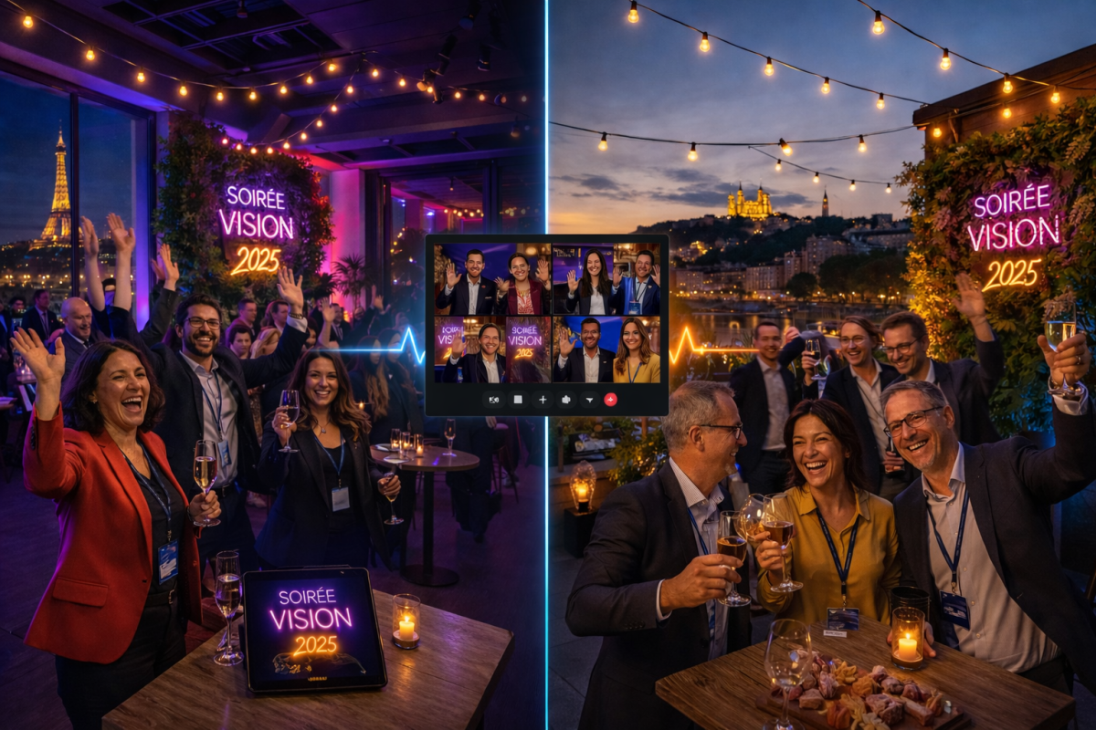 → La soirée récompense hybride multi-sites : scénographie identique sur chaque site, pitch de direction diffusé en simultané, blind test synchronisé, DJ, cocktail dinatoire et aftermovie professionnel. C’est exactement ce que nous avons réalisé pour Masteos : 250 collaborateurs réunis simultanément à Paris et Marseille, une même soirée, deux villes, une expérience unifiée.